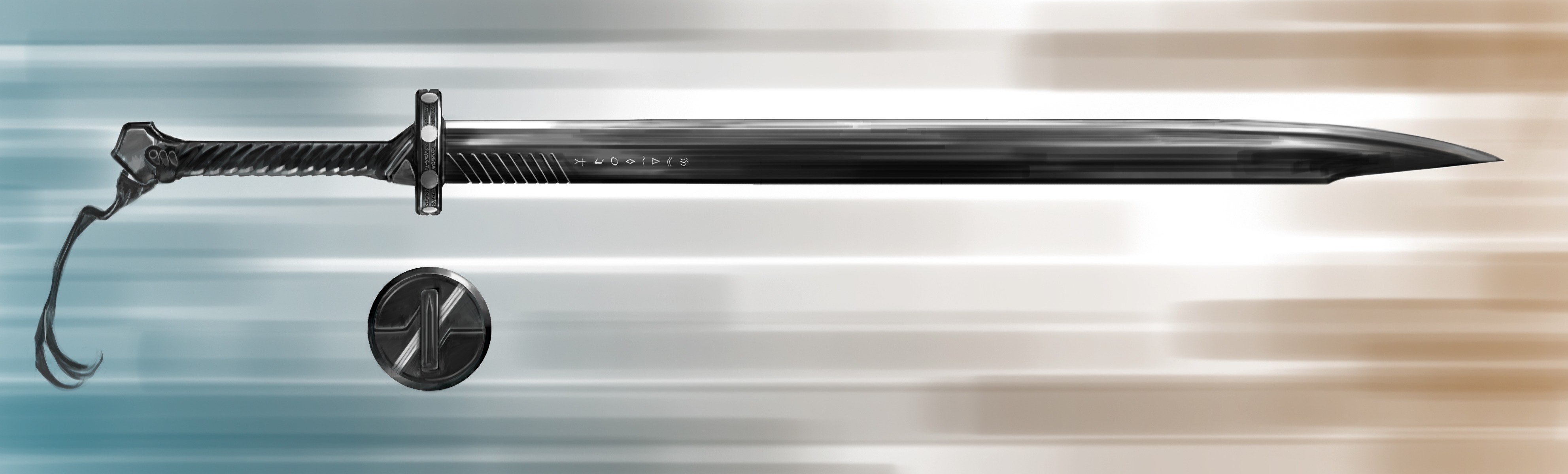 Covabalan is a single edged sword with almost no hand guard. In place of a traditional handguard Covabalan has a round guard with a dial. On the dial there are six rings carved, each of them representing one of the six elements, pyromancy, hydromancy, terramancy, aeromancy, animancy, and umbrancy. Depending on which element was selected and the slid up into the guard determined the elemental attribute the blade adopted. When magic is flowing through the blade the Gulscrib etched into the blade will light up with the corresponding elements color. The mithranium gives the blade its black look.